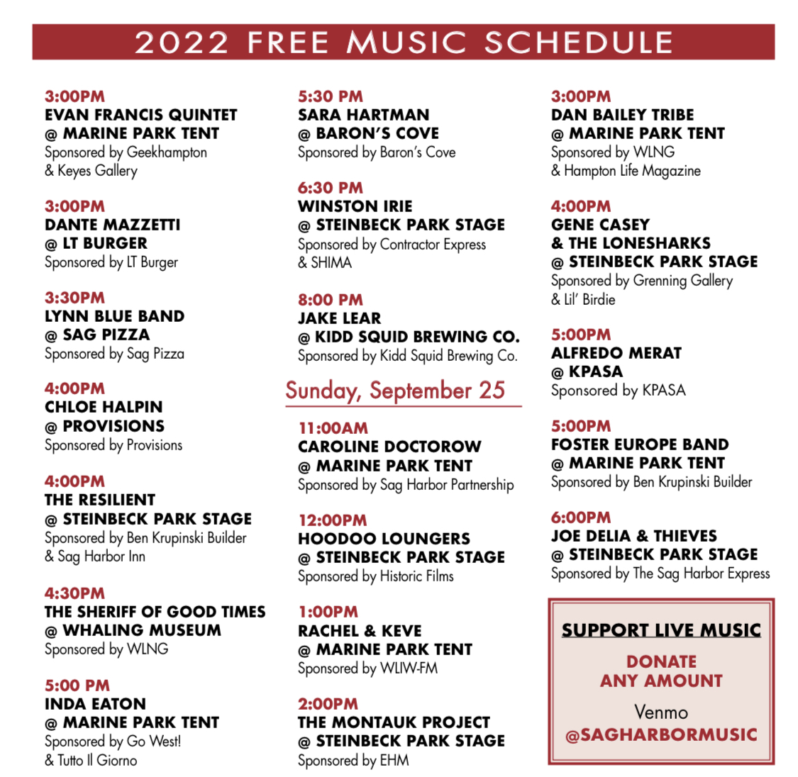 Sag Harbor American Music Festival Brings the Bands to You This Weekend. Local to Global Jazz and Blues Roots and Folk Pop and more. We Dont Have Fees.